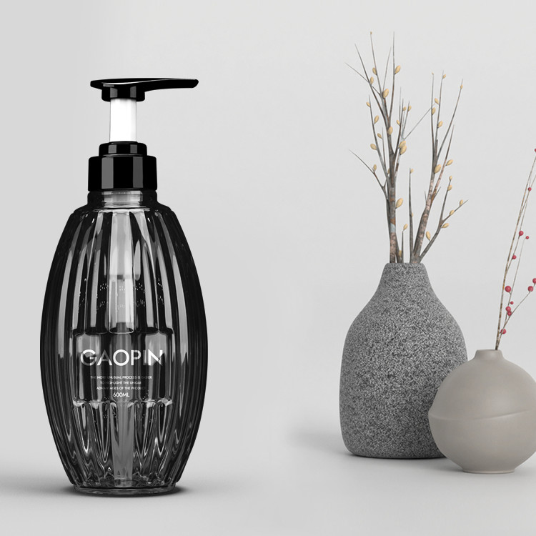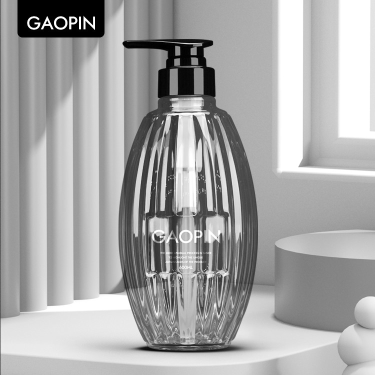 بطری شامپو به شکل استوانه شفاف، مواد PET، لمس نرم.